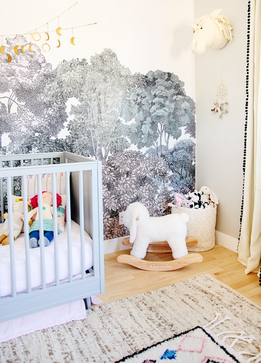 Veneer Designs creates a whimsical baby girl nursery in true Boho baby style with the woodland wall mural, the layered rugs, moon garland and plenty of storage for toys and stuffies.
